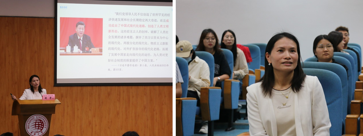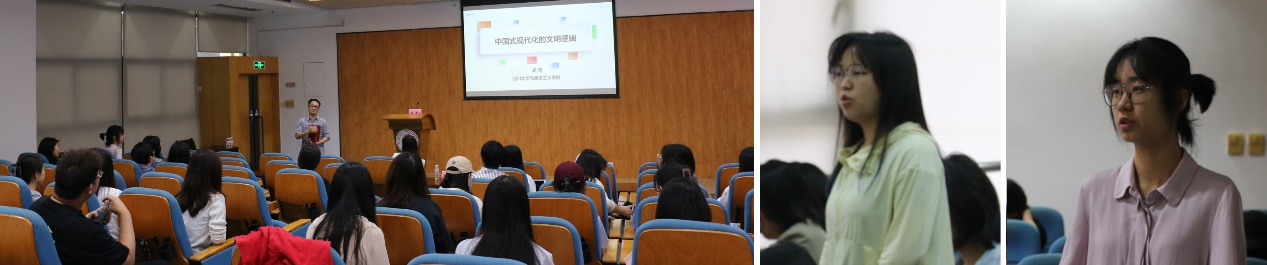 胡芳教授首先介绍了讲座的选题缘由,强调哲学系学生应注重将哲学的抽象辩证思维运用到实际生活中去,回应时代问题。接着,胡教授对“为什么说中国式现代化开启了一种新的文明类型”这一问题给出了鞭辟入里的讲解。胡芳教授从人类文明的发展阶段等角度出发,同时对比了西方现代化的方式,指出中国式现代化是通过道路的成功来进行反思而产生的独特理论构造,其创造文明新形态的生成逻辑在于对中华优秀传统文化的民族认同、对马克思主义文明思想的运用以及现代化道路的实践性的维度。胡芳教授继续对中国式现代化创造了什么样的新的文明形态的问题进行了深入的剖析。胡教授指出,中国式现代化为人类文明注入了新的活力,以经济为例,中国在经济上取得成功的重要原因在于对经济技术的变革,以及在保持社会稳定的同时实现高质量发展。胡教授同时指出,中国对贫困问题的历史性解决获得了全球的广泛认可。