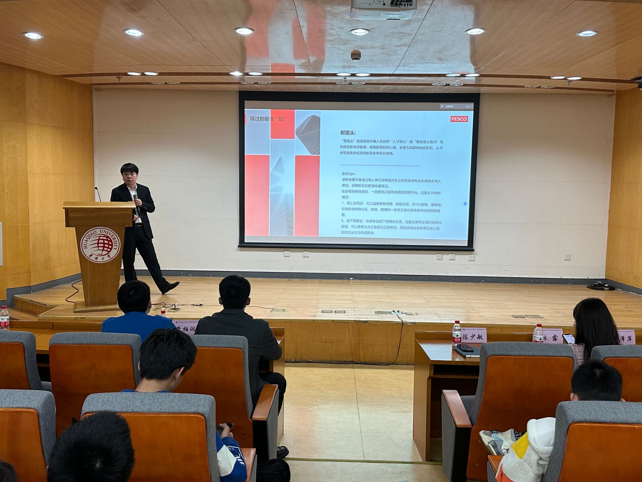 讲座伊始,招聘负责人黄柏润简要介绍了FESCO福建公司。随后,政策专家王家辉从2023年就业形势和毕业生去向切入,介绍了福建省各市的人才补贴政策,并分享福建省内五险一金政策通识。法务合规部经理陈少敏强调在求职过程中应警惕“假猎头”“乱收费”等陷阱,并就协议和合同的签订给予一些建议。黄柏润则从自我认知、简历制作和面试技巧三方面分享了应届生的求职面试小技巧,并宣传介绍FESCO福建公司的一些岗位和薪酬福利。最后在互动提问环节,团委书记鞠芳针对同学们所关心的户口以及就业后是否限制考研考公这两方面向专家提出了问题,王家辉详细解释了厦门市的落户政策,同时也回应道,除小部分岗位外,就业并不会导致未来考公考研受到政策限制。