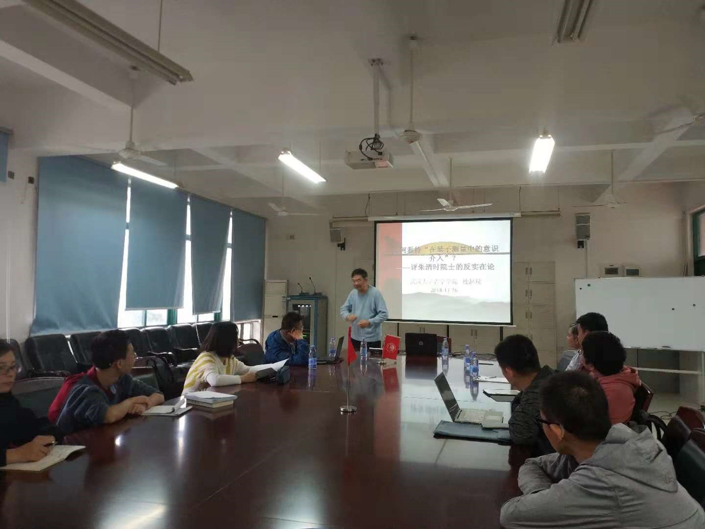 2018年11月26日上午,武汉大学哲学学院桂起权教授应yl9193永利集团和问题哲学研究中心邀请,作了一场题为“如何看待‘在量子测量中的意识介入’?——评朱清时院士的反实在论”的学术讲座。讲座由马雷教授主持,哲社学院部分师生聆听了讲座。