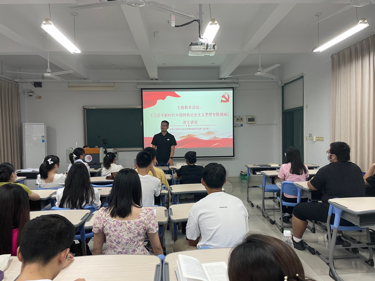 此外,支部书记带领支部成员开展《习近平新时代中国特色社会主义思想专题摘编》原文研读,并指出要坚持读原著、学原文、悟原理,牢牢把握“学思想、强党性、重实践、建新功”的总要求,深入学习贯彻落实党的二十大精神,深刻领悟“两个确立”的决定性意义,更加自觉增强“四个意识”、坚定“四个自信”、做到“两个维护”,充分发挥学生党支部的战斗堡垒作用,结合支部成员各专业优势,以实际行动投入到主题教育活动中去。