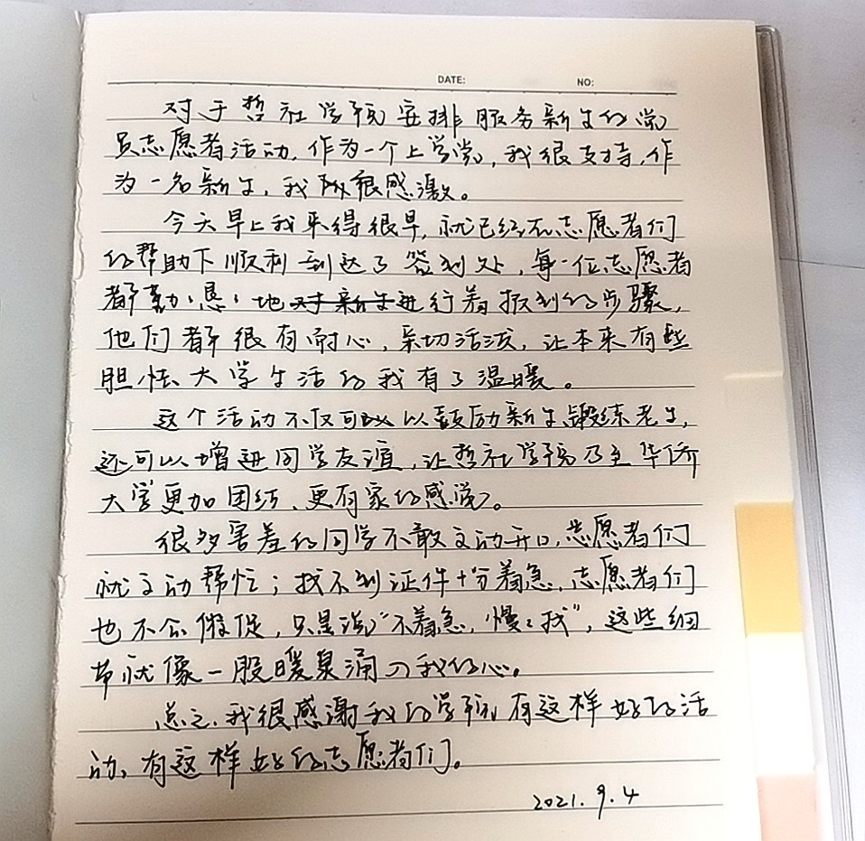 来自2021级社会学1班的林芳竹同学,用纸笔写下了自己对于迎新志愿服务的想法。该同学表示,自己作为一个新生非常感激这一次的志愿服务。并且认为,这种方式可以鼓励新生、锻炼老生,增进同学友谊,让哲社学院乃至永利集团更加团结,更有家的感觉。