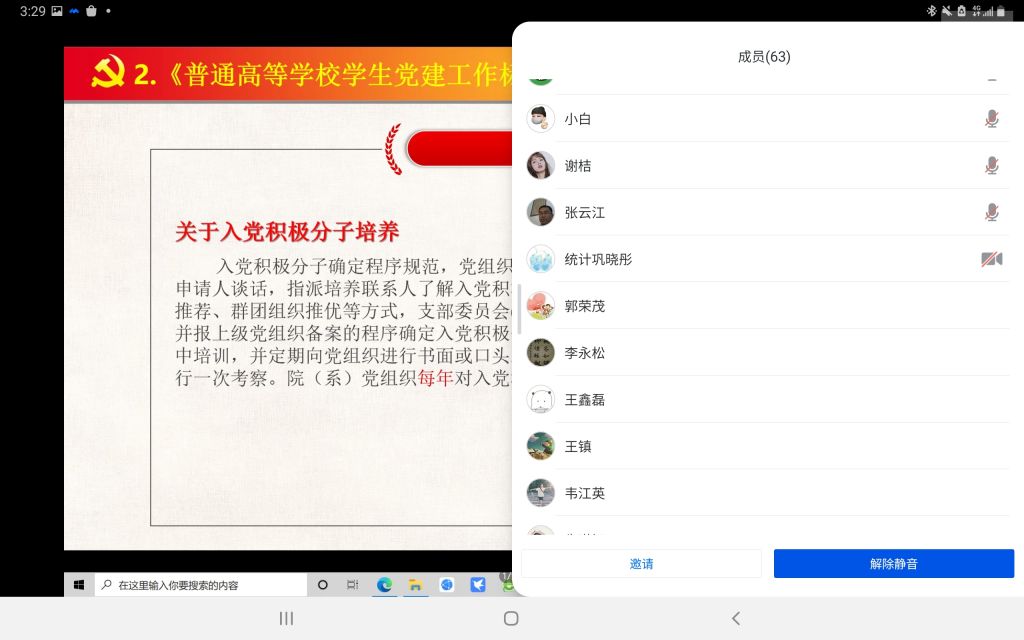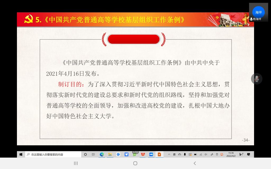 为深入学习贯彻习近平新时代中国特色社会主义思想,加强我校基层党组织建设,充分发挥基层党组织的战斗堡垒作用,不断提升党支部的活力,提高党支部工作的效率和水平, 4月2日下午3:00,哲社学院和统计学院于腾讯会议平台,共同召开党建工作培训会,哲社学院党支部全体支委参加培训。会议由统计学院党委组织委员杨海坪同志主讲。
