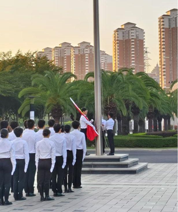 晨曦微露,国旗护卫队迈着整齐有力的步伐护送五星红旗至旗杆下随后,国歌奏响,五星红旗冉冉升起,庄重震撼。全体师生神情庄重,肃立在场,目光紧随缓缓上升的国旗行注目礼,表达对祖国的热爱与崇高敬意。