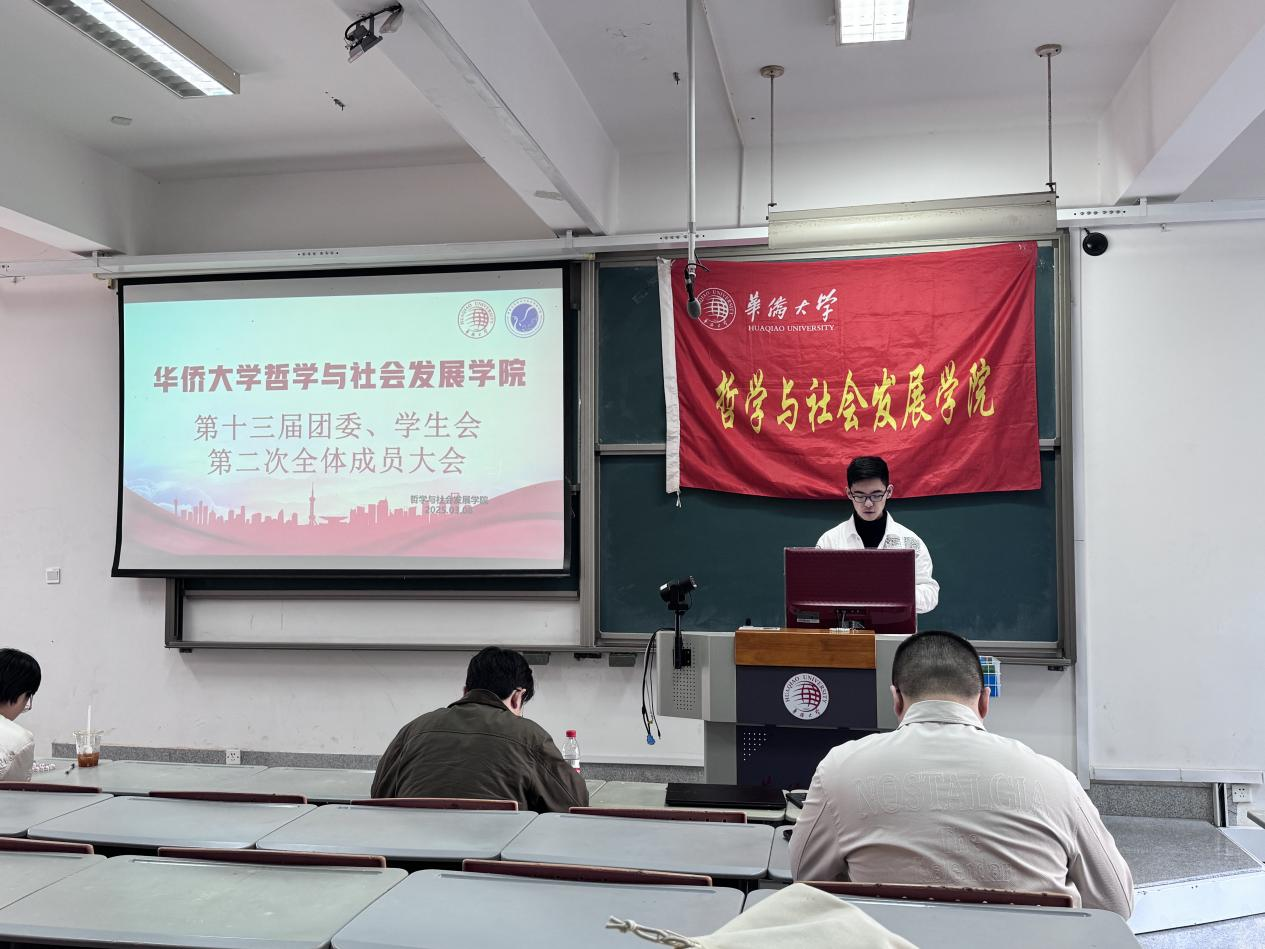 哲社学院第十三届团委、学生会第二次全体成员大会于3月8日下午F4-101召开。哲社学院团委书记鞠芳、辅导员张振泽出席本次会议,团委、学生会全体成员与会。本次会议由团委副书记姜乃新主持。