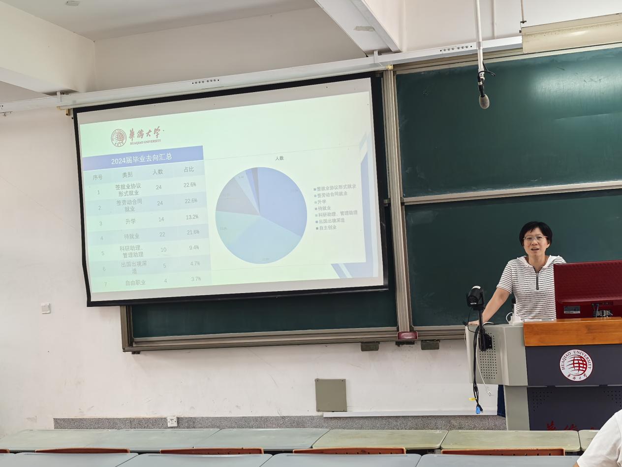 会议伊始,鞠芳首先为大家分享了学院过去一年的就业情况,为同学们提供就业参考的同时也提醒同学们应认清当前就业形势,明确自身目标,做好就业规划。