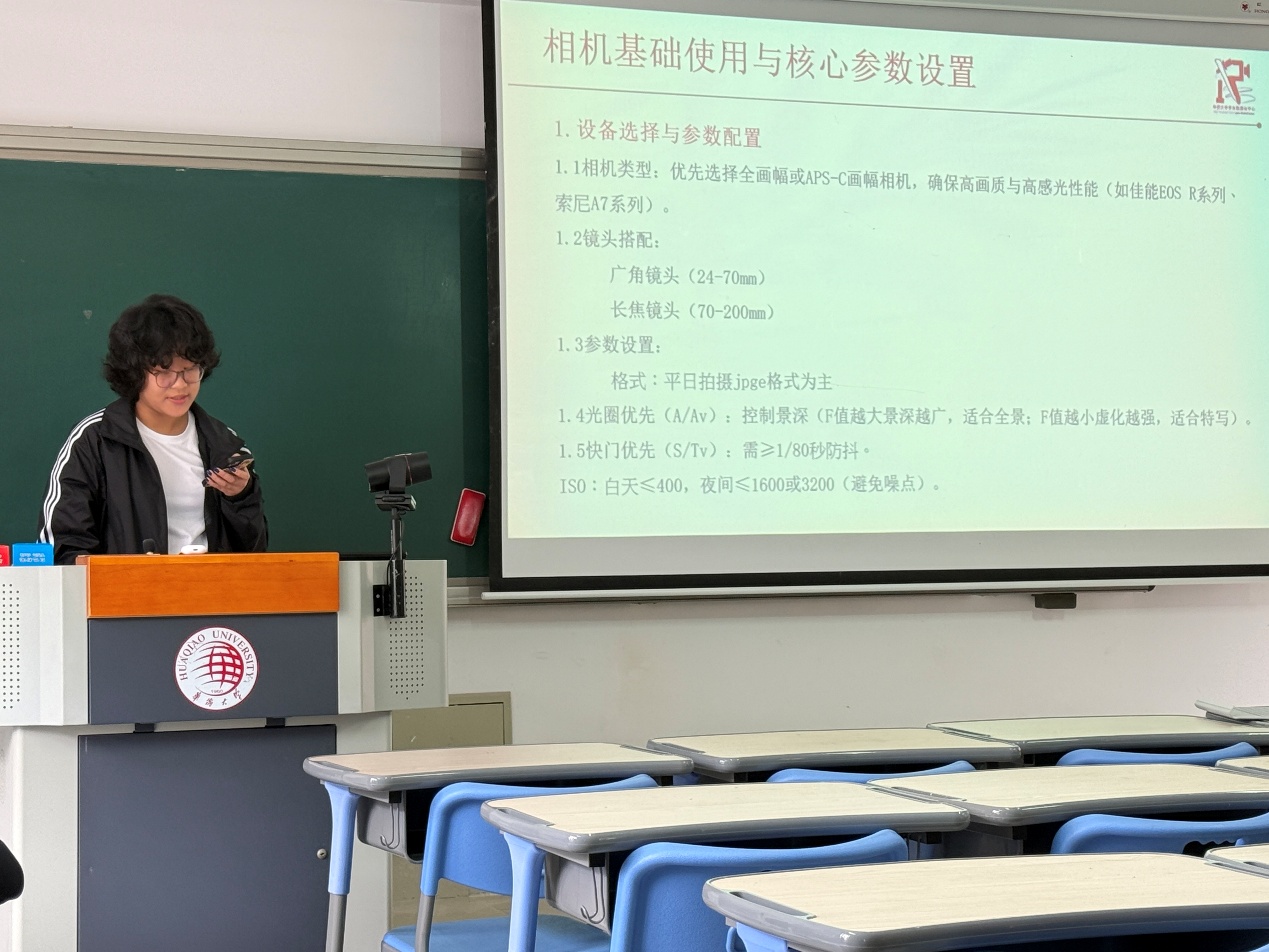 在新闻摄影培训中,摄影部王梓渝详细介绍了相机基础操作、核心参数设置与校园活动拍摄技巧,结合实例分享了活动现场构图、光线运用等实用经验,有效提升了参会人员的影像记录质量与视觉呈现能力。