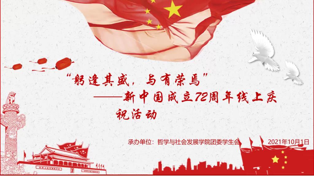 为科普新中国成立相关知识,激发学生的爱国热情,丰富在校学生国庆假期的文化生活,哲社学院团委、学生会于2021年10月2日组织开展“躬逢其盛,与有荣焉”庆祝新中国成立72周年线上活动。