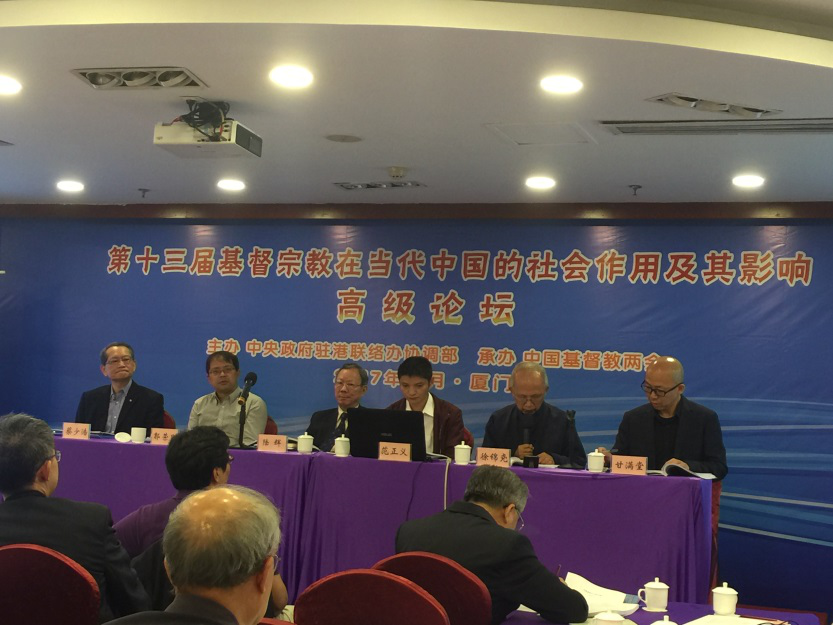 由中央人民政府驻港联络办协调部主办、中国基督教两会承办的第十三届“基督宗教在当代中国的社会作用及其影响”高级论坛于11月14日-15日在厦门天鹅大酒店召开。此次论坛有两大特点。一是两地,参加论坛的人员来自香港和内地两个地方,目的在于加强香港与内地的交流与联系。二是三界,与会人员包括基督教界、学术界和政界的人士。参加此次论坛,一方面有利于加强我校宗教学专业和香港、内地同行的学术交流,另一方面也有利于加强我校宗教学研究者与基督教界、政界人士的沟通与联系。