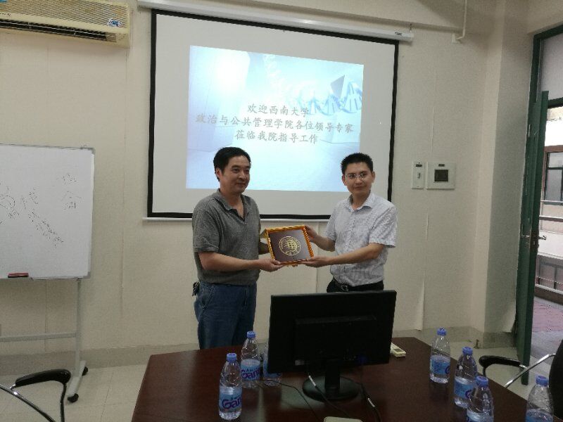 2017年9月22日下午,西南大学政治与公共管理学院李栋轩书记,哲学系副主任、书记、伦理学学科负责人任丑教授博导,中国哲学学科负责人高秀昌教授博导,岳跃副教授,邱德胜副教授,王俊副教授等一行来我院进行学术交流,我院许斗斗院长、薛秀军书记、刘荣军教授、冯兵教授、陈庆超教授、刘守政副教授参加了此次接待与会谈。