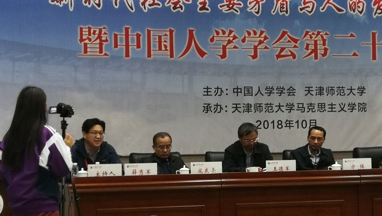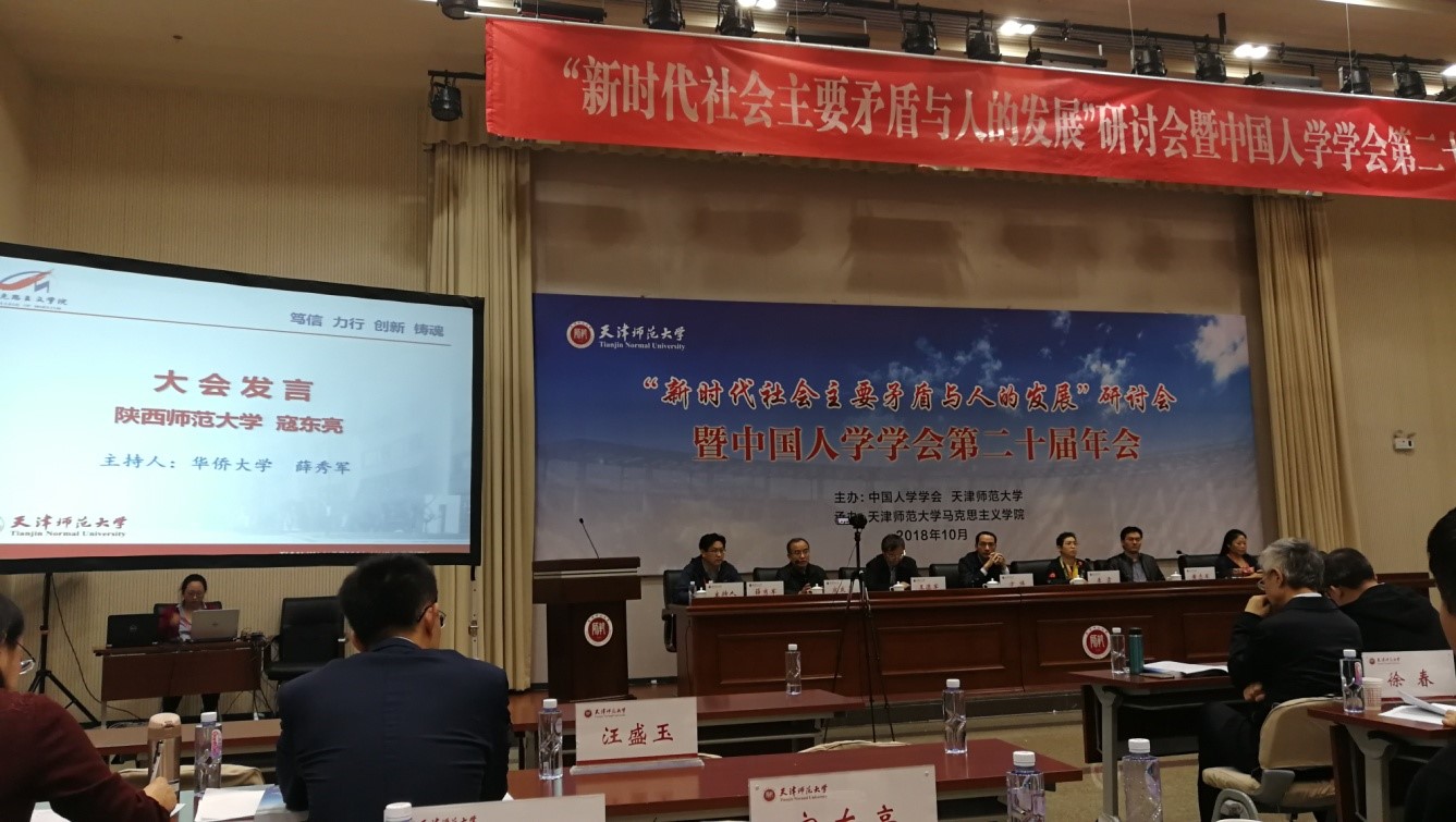 2018年10月20日至21日,由中国人学学会和天津师范大学主办、天津师范大学马克思主义学院承办的“新时代社会主要矛盾与人的发展”研讨会暨中国人学学会第二十届年会在天津师范大学召开,我院薛秀军教授受邀参会,并作为主持人主持了一场大会发言。会议期间,薛秀军教授还就提交大会的论文“新时代的三重指向与我们的历史担当”等相关问题与来自北京大学、中国人民大学、中央党校、南开大学、中山大学、武汉大学、西安交通大学、北京师范大学等全国各地的专家学者进行了交流讨论。