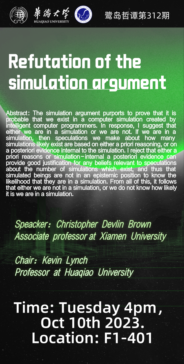 【讲座预告】哲社学院鹭岛哲谭系列讲座第312期Refutation of the simulation argument