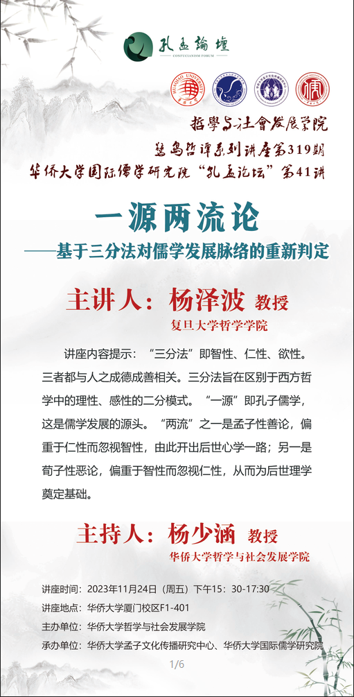 【讲座预告】哲社学院鹭岛哲谭系列讲座第319期一源两流论——基于三分法对儒学发展脉络的重新判定