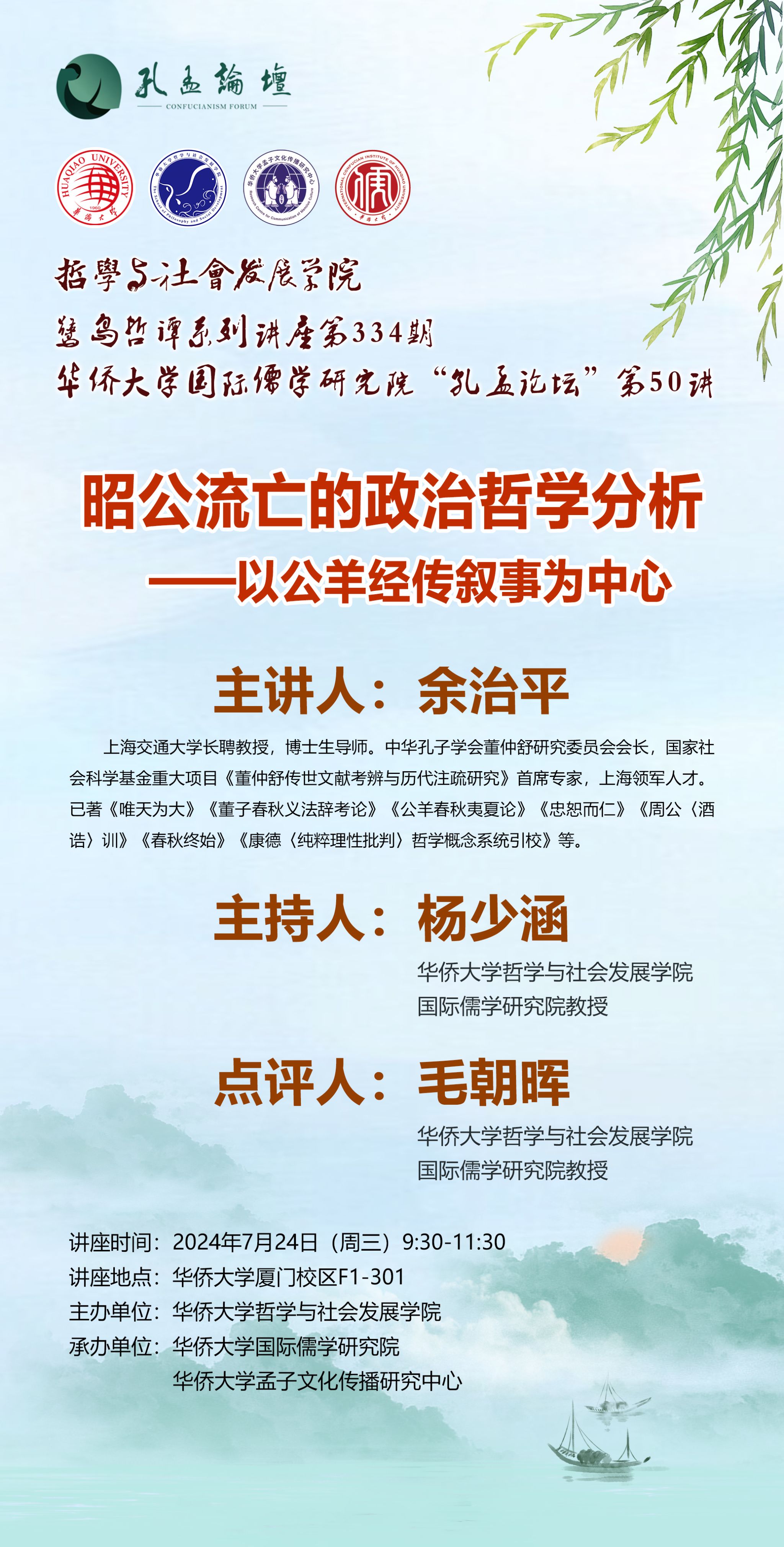 【讲座预告】永利集团国际儒学研究院“孔孟论坛”第50讲暨鹭岛哲谭系列讲座第334期之昭公流亡的政治哲学分析——以公羊经传叙事为中心