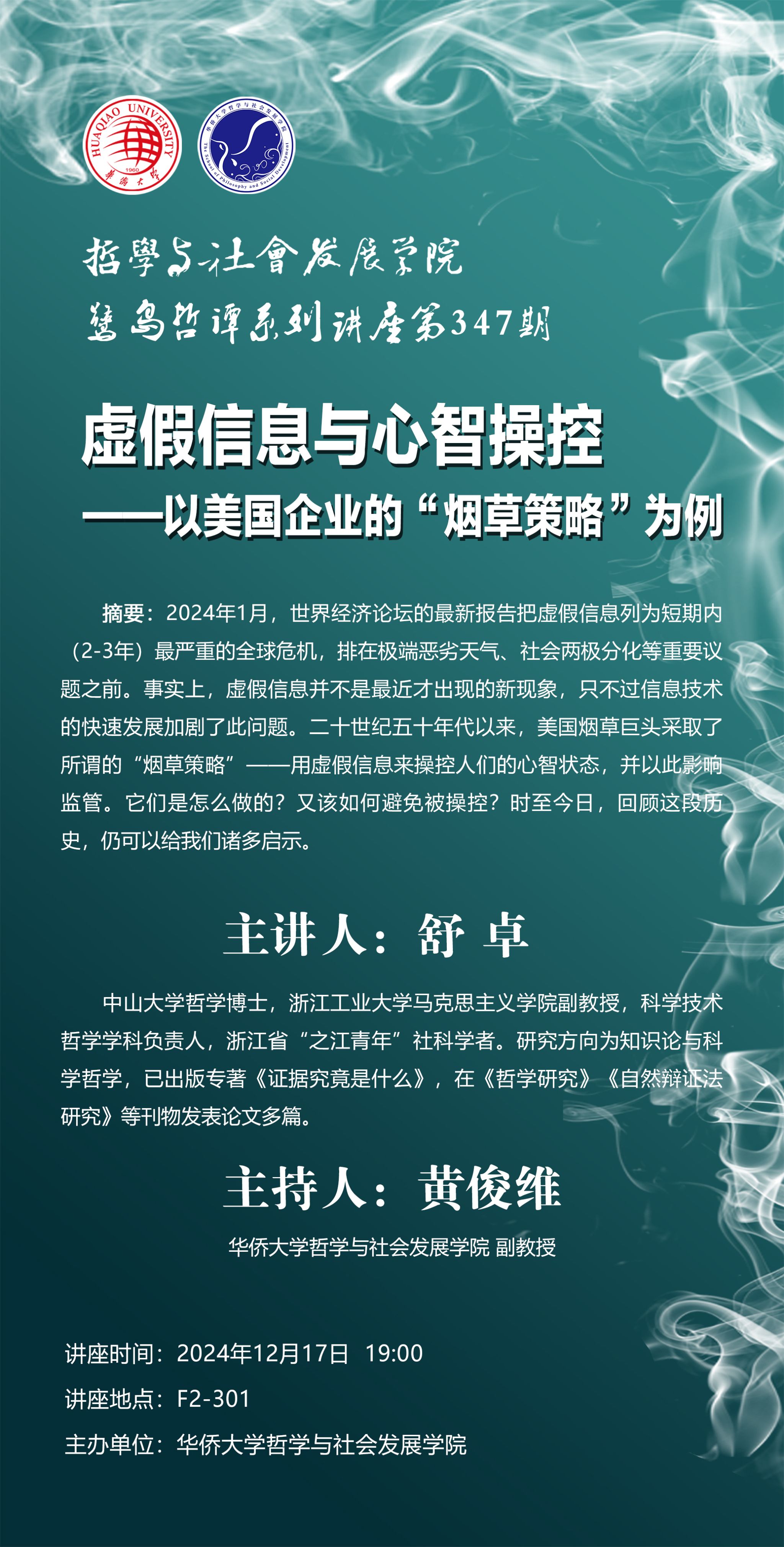 【讲座预告】哲社学院鹭岛哲谭系列讲座第347期之虚假信息与心智操控——以美国企业的“烟草策略”为例