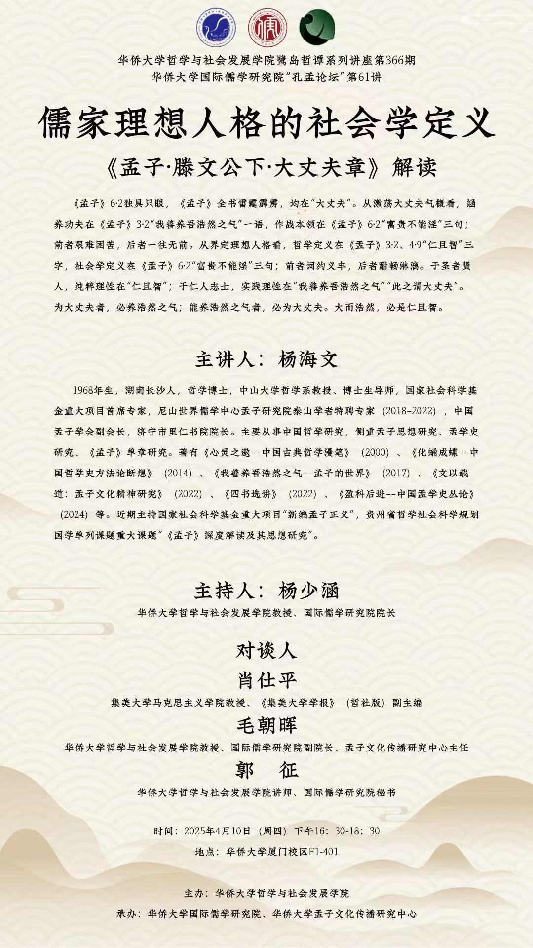 【讲座预告】永利集团国际儒学研究院“孔孟论坛”第61讲暨鹭岛哲谭系列讲座第366期之儒家理想人格的社会学定义——《孟子·滕文公下·大丈夫章》解读