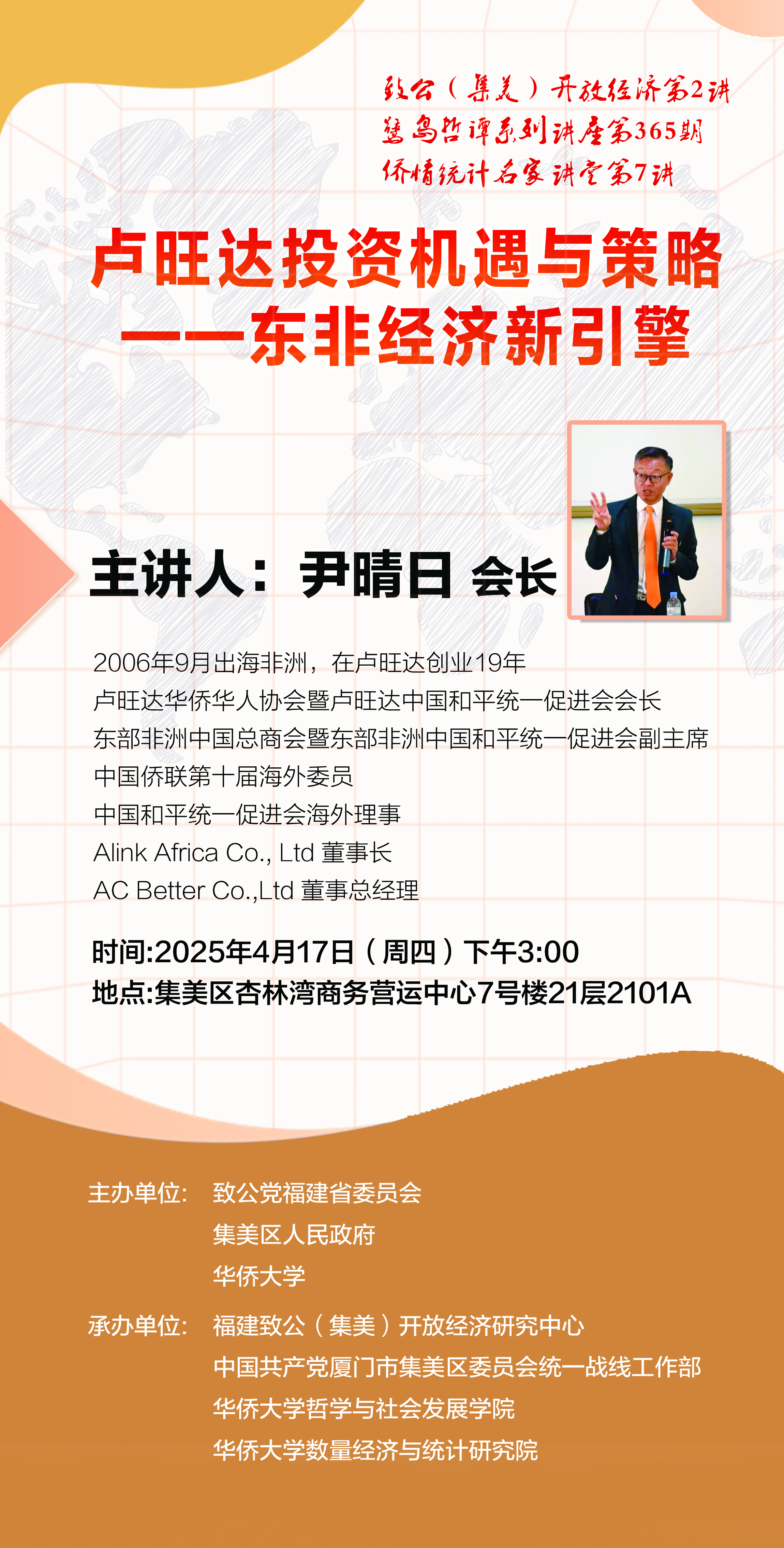 【讲座预告】致公(集美)开放经济第2讲暨哲社学院鹭岛哲谭系列讲座第365期暨侨情统计名家讲堂第7讲之卢旺达投资机遇与策略——东非经济新引擎