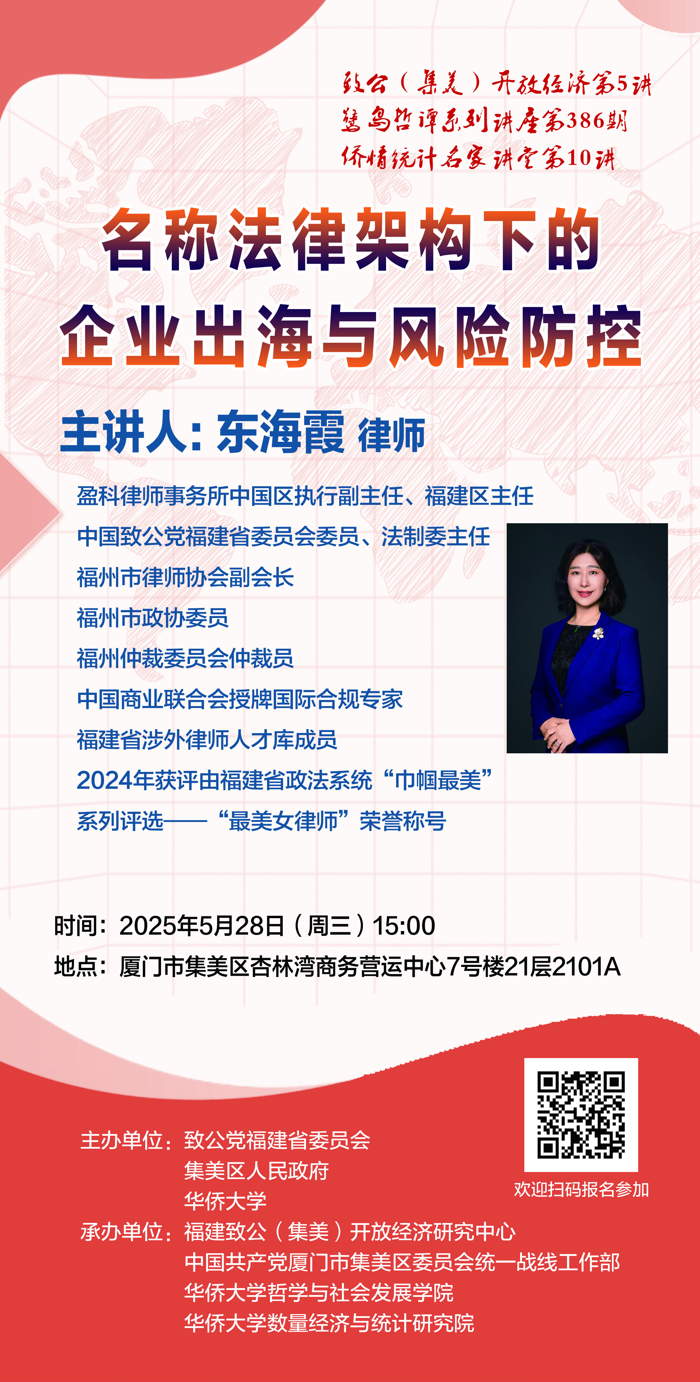 【讲座预告】致公(集美)开放经济第5讲鹭岛哲谭系到讲座第386期侨情统计名家讲堂第10讲之名称法律架构下的企业出海与风险防控