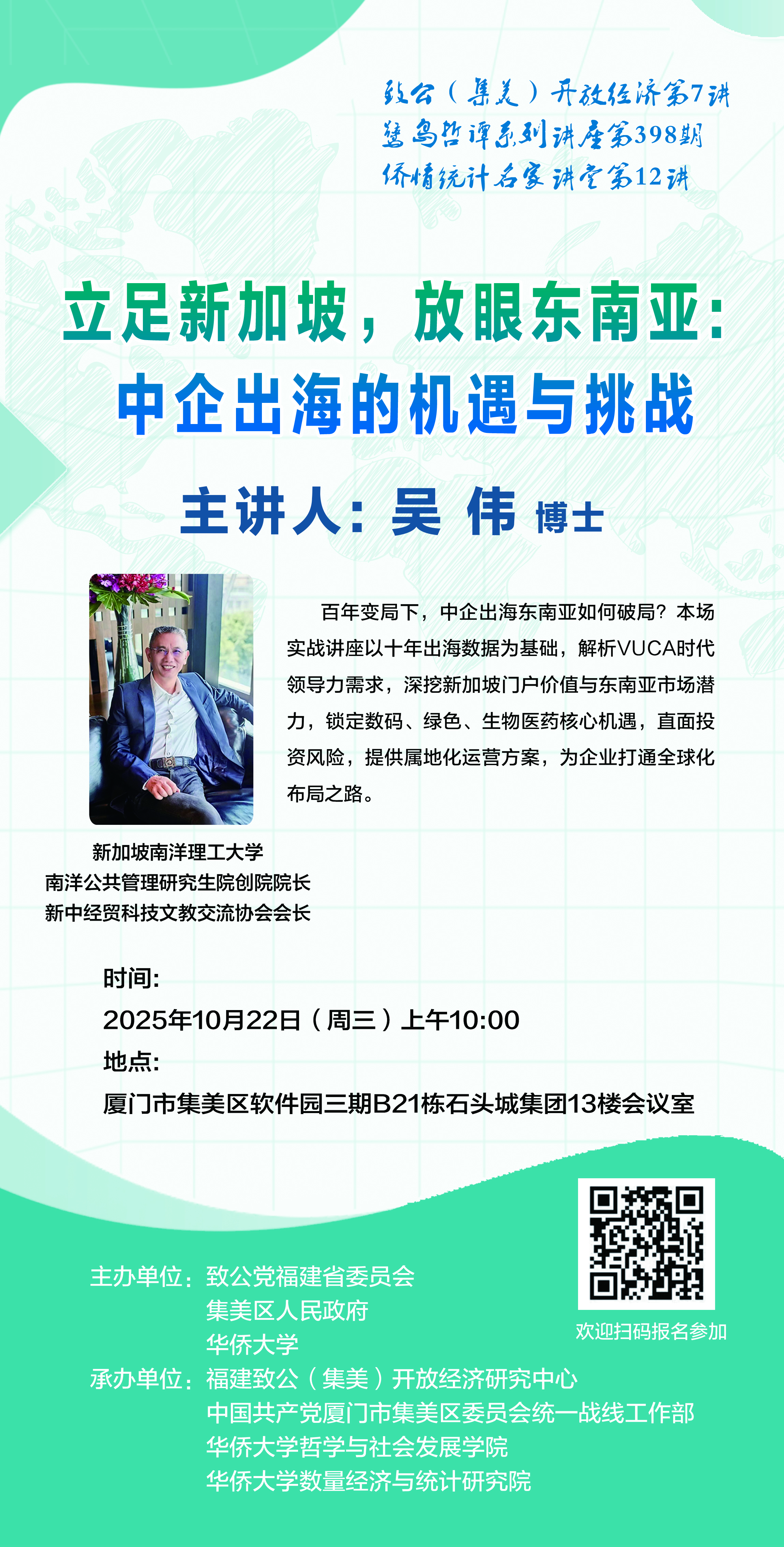 【讲座预告】致公(集美)开放经济第7讲鹭岛哲谭系到讲座第398期侨情统计名家讲堂第12讲之立足新加坡,放眼东南亚:中企出海的机遇与挑战