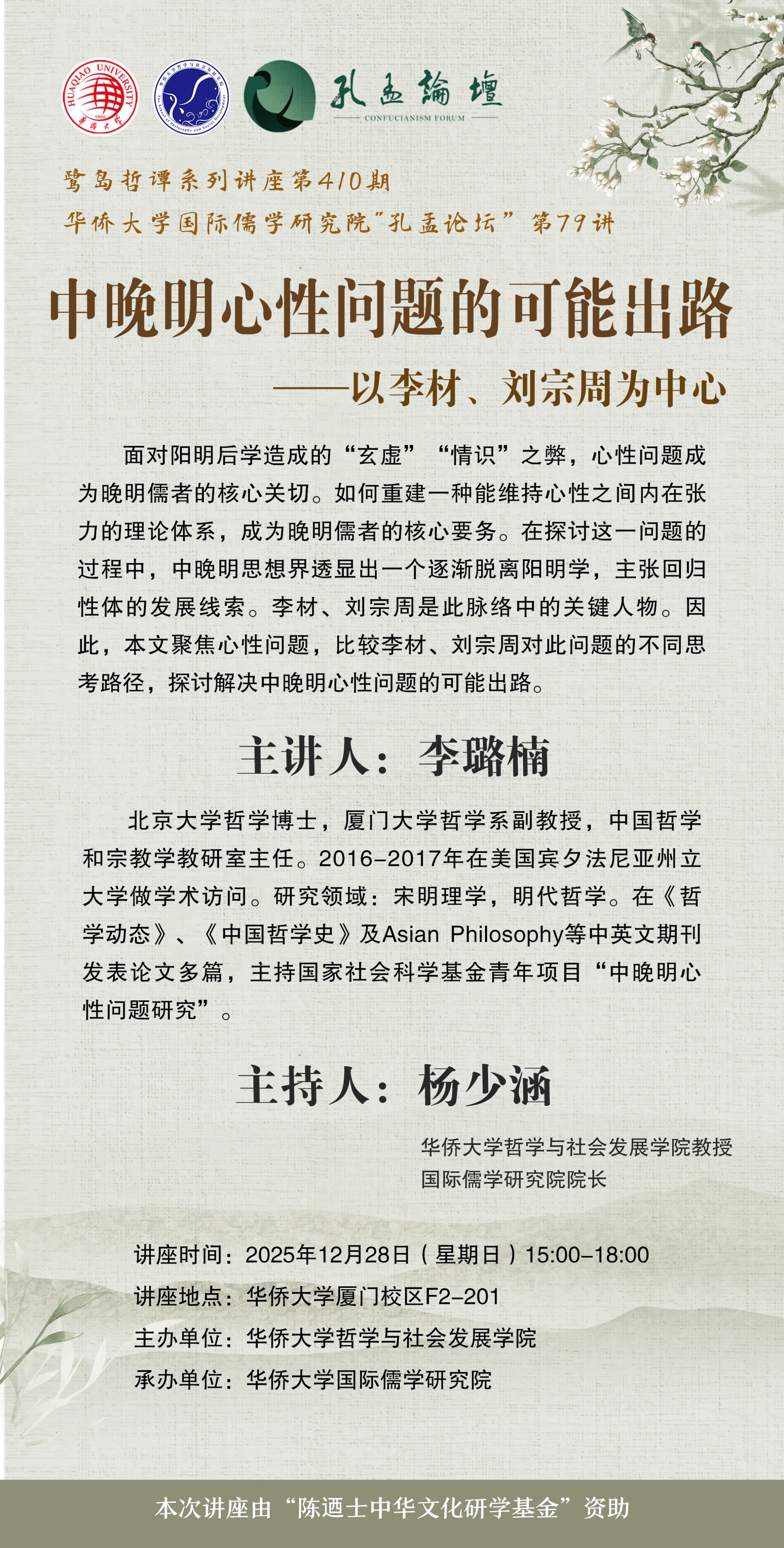 【讲座预告】鹭岛哲谭系列讲座第410期暨永利集团国际儒学研究院"孔孟论坛"第79讲之中晚明心性问题的可能出路——以李材、刘宗周为中心