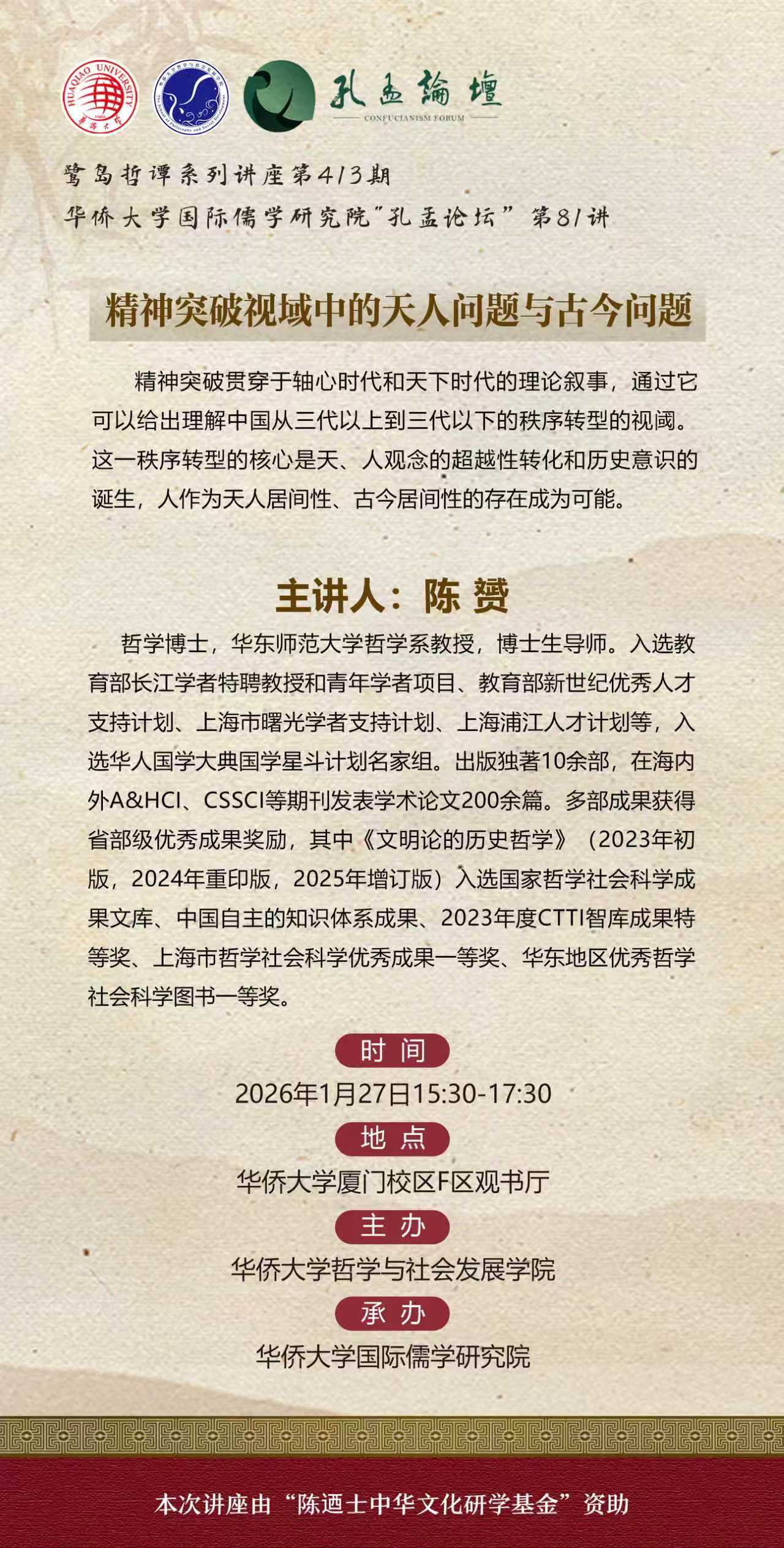 【讲座预告】哲社学院鹭岛哲谭系列讲座第413期暨国际儒学研究院“孔孟论坛”第81讲之精神突破视域中的天人问题与古今问题
