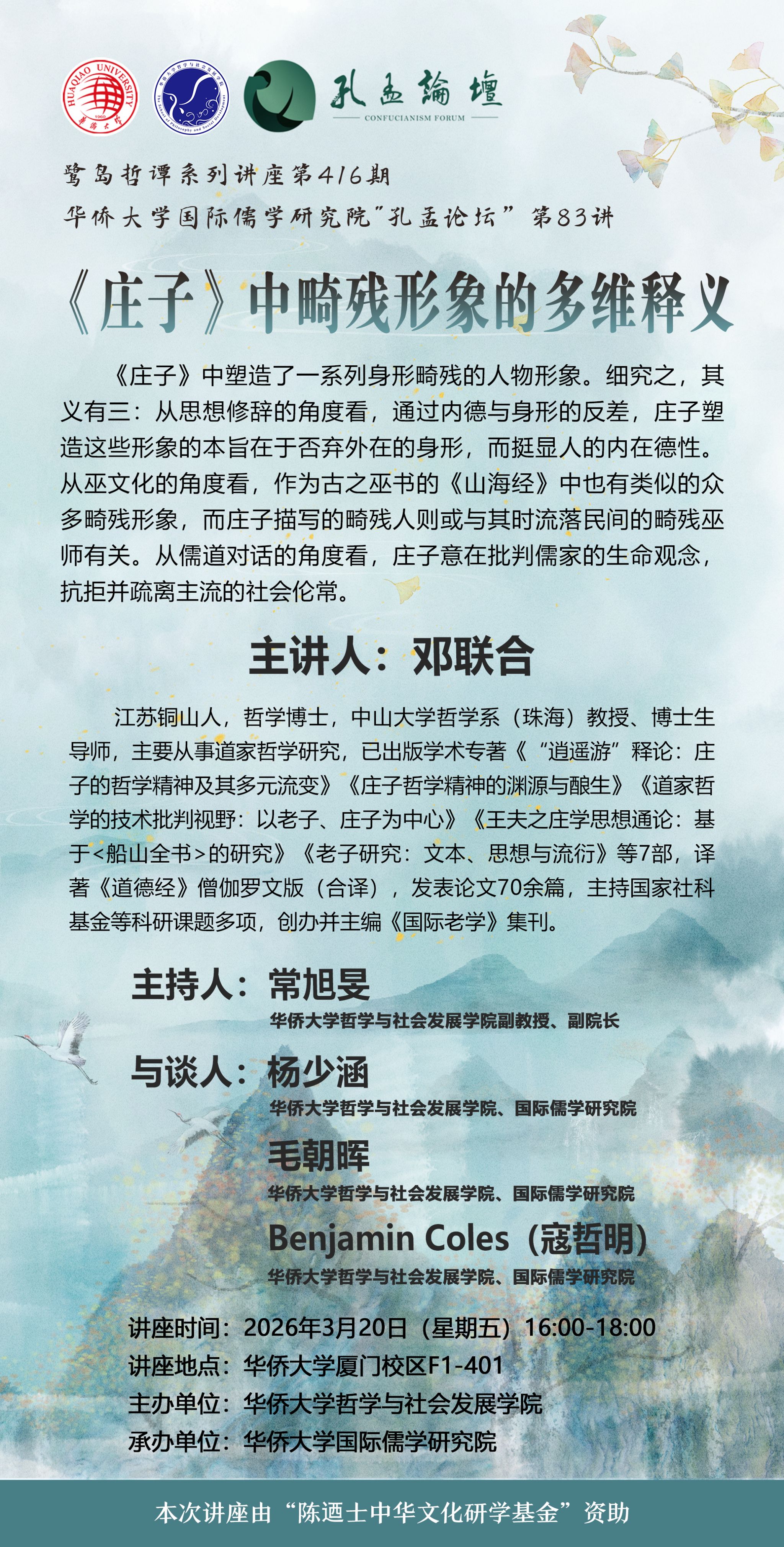 【讲座预告】哲社学院鹭岛哲谭系列讲座第416期暨“孔孟论坛”第83讲之《庄子》中畸残形象的多维释义