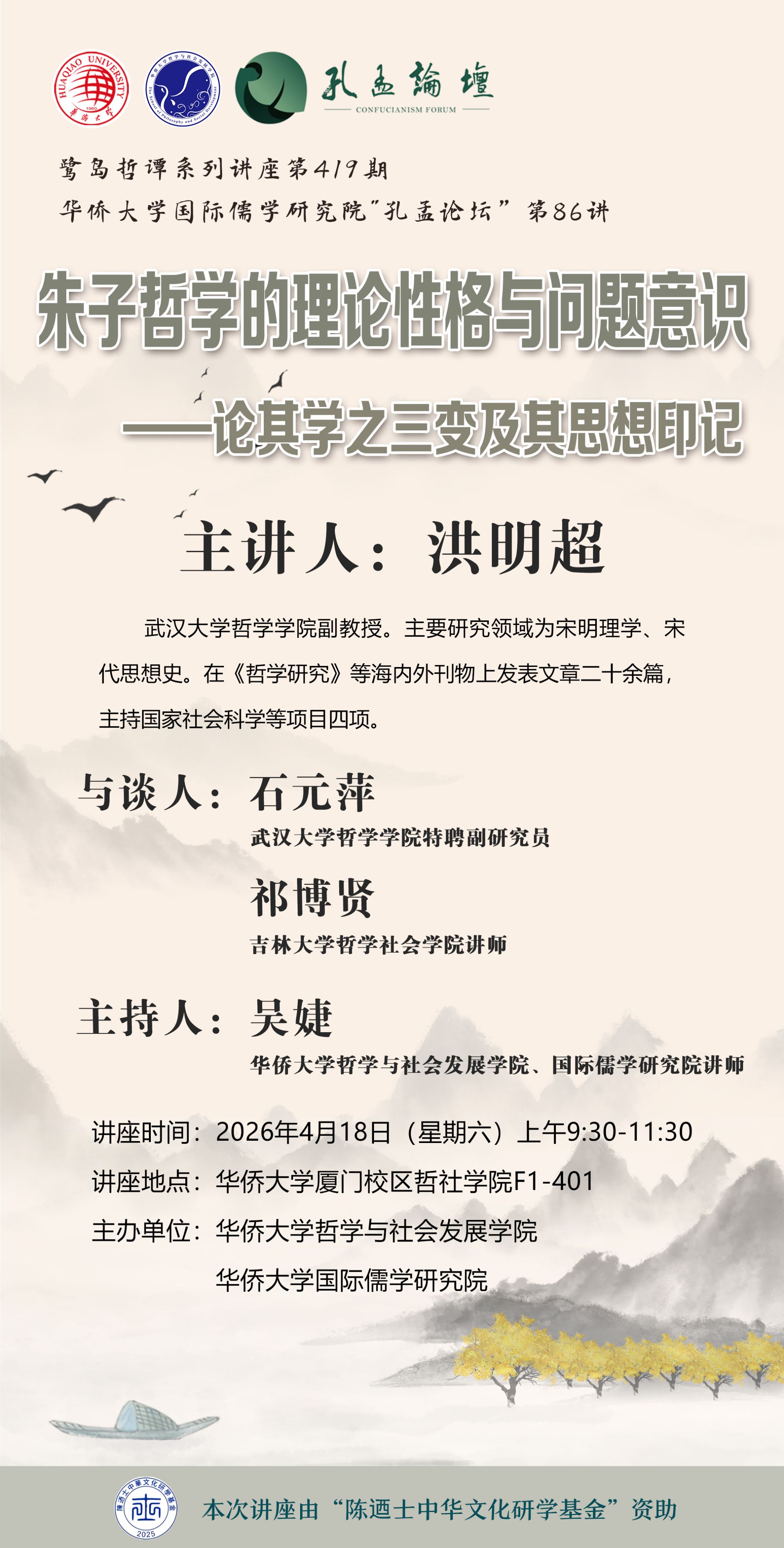 【讲座预告】哲社学院鹭岛哲谭系列讲座第419期暨孔孟论坛第86讲之朱子哲学的理论性格与问题意识——论其学之三变及其思想印记