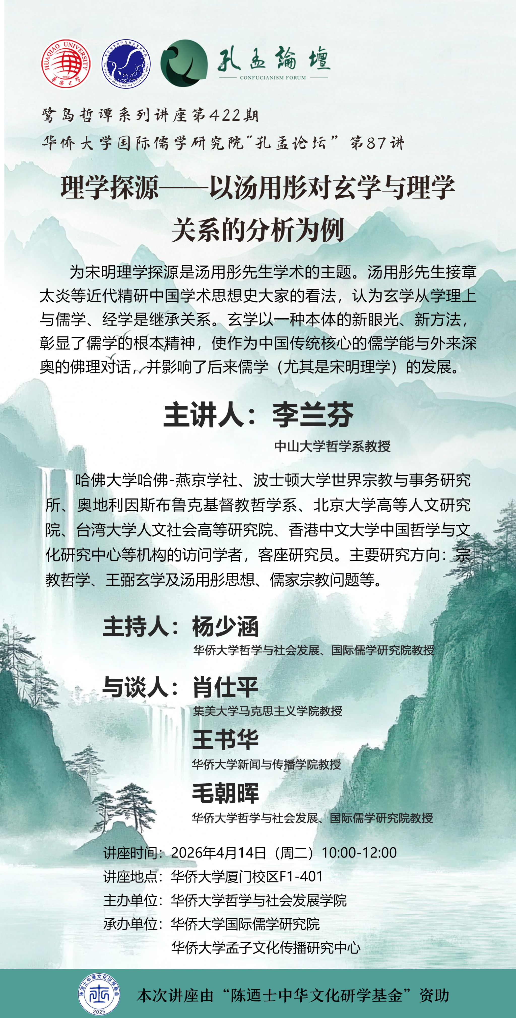【讲座预告】哲社学院鹭岛哲谭系列讲座第422期暨“孔孟论坛”第87讲之理学探源——以汤用彤对玄学与理学关系的分析为例
