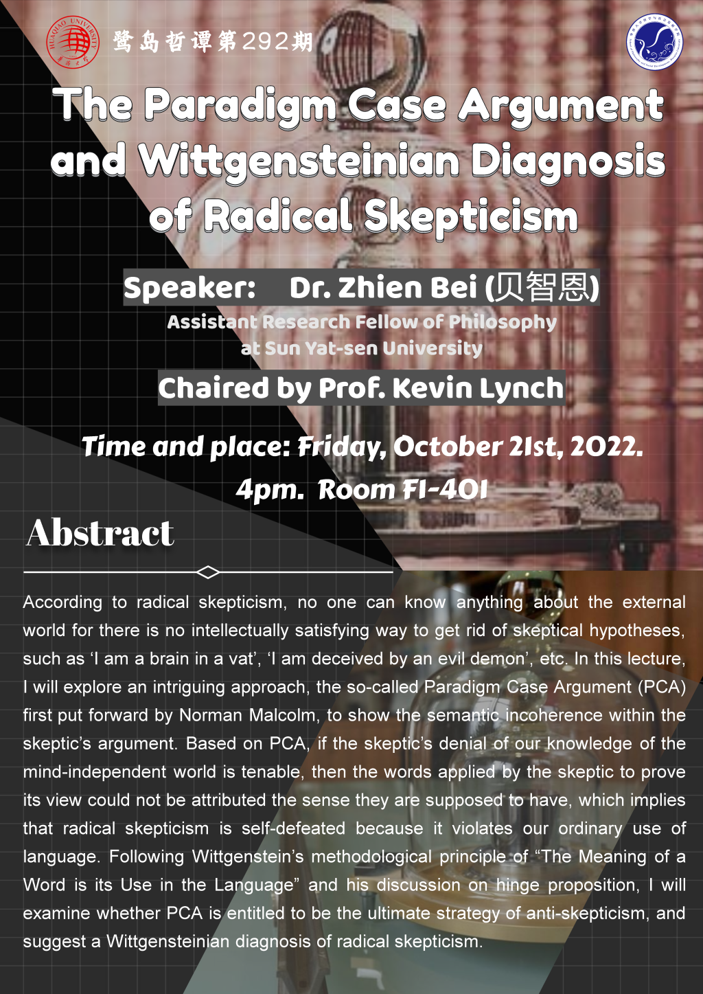 【讲座预告】哲社学院鹭岛哲谭系列讲座第292期之The Paradigm Case Argument and Wittgensteinian Diagnosis of Radical Skepticism